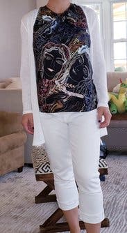 This top is so pretty! The design is striking and the silk is heavy with a lovely drape. Perfect with dress pants, jeans, or leggings and so fun you want to wear it every day. I lost count of how many times I wore it...it hurt to send it back!