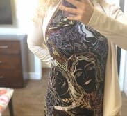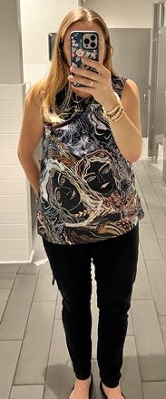 Cute pattern that showed up well on zoom calls. Comfortable material. Has a knot detail by the neck so it looked good with a jacket - and the faces pattern was fun.