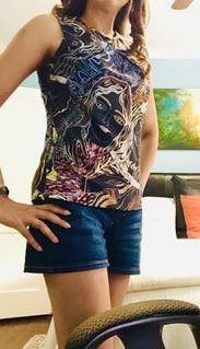 Put this top on and immediately became a fan! From the print to the fit. Fit a little more snug than I imagined but great fit. If you want it to fit looser, size up. Knot detail at the top is a cute touch.