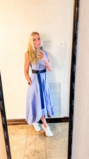 Beautiful color and fit. I love the navy belt and navy under hem. It is a wrinkly cotton fabric. It was a TAD big on me so if I lose weight, I may go down a size. I considered buying it as it’s perfect for summer.