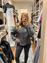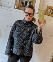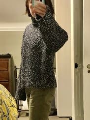 I will absolutely rent this sweater again! So soft, warm, and cozy. Oversized fit, but hangs in a flattering way. Lots of different types of threads/yarns in the knit, so there is a lot of variation in the colors and textures. I would say this runs true to size, but if you're between sizes, either size should fit - there's plenty of room.