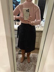 I’m obsessed with this skirt. I’m between sizes so I was thinking I might want to downsize but I love the style and there is a big slit that a lot when you sit down but I wore it with tights so I felt comfortable.