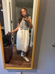 Got so many compliments on this! Very easy to wear and love how it looked with sneakers. Wrinkles easily at the bottom but ironing well to start helps.