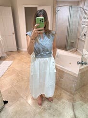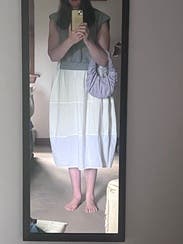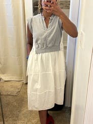 RENT. THIS. DRESS. I'm obsessed. It's comfortable, casual, elevated and interesting. The top grey part is like a soft tshirt/sweatshirt material, the white is crips cotton, with cute eyelet details on the bottom. The waist has adjustable side belts (see detail photo) that you can keep loose for flowy or tighten for a more fitted silhouette. This feels like a perfect causal weekend or city-venturing dress. I'm a 2/4, closer to a 2 on top, and the XS fit perfectly -- it's more fitted on top and flowy on the bottom.