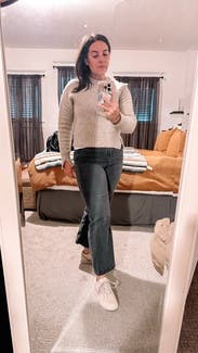 I love this sweater. Will rent again/buy. Great weight for transitional spring weather. Length is perfect for high waist jeans.