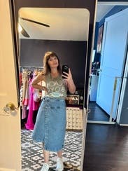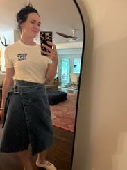I absolutely loved this long denim skirt! The fabric is high-quality and comfortable to wear throughout the day. I appreciate the length—it's perfect for pairing with boots or sneakers, making it a great option for any season. I don’t like the way the belt hangs so I tucked it into the back of the waist. If you're looking for a stylish and comfortable denim piece, I highly recommend this one! Will rent again.