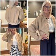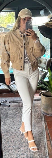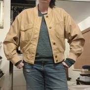 This Phillio Lim light beige faux leather bomber gives classy vibes and will elevate any outfit. I ordered the L and at 5'8', 160, this was too long in the sleeve and body. A medium would be perfect. Size down and you will love this jacket!