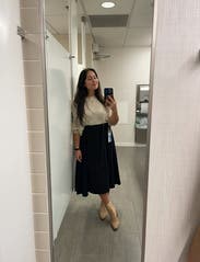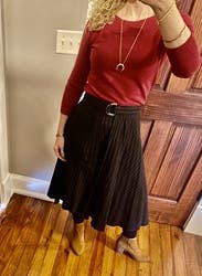 The belt cinched your waist and made the skirt look tailored to you. Great heavy, thick material that made the skirt flow and look high end. Although some of the pleats straightened out in the back which was a bummer.