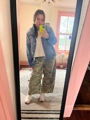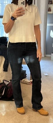 This paired great with oversized jeans and trousers. The material was warm and had good stretch. The little peep holes on the sides were a nice touch. With the wrong bra, it can be a little "tenty" but an easy fix. The large button detail was also cute.