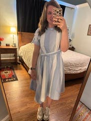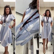 Wore this in a business “smart casual” setting and liked that it was professional but breezy for a warm day. I would have liked to adjust the waist to fit better, and I tend to struggle with oversized bust areas so this ultimately fit too large from me, personally. But loved being able to wear something different for a work situation.