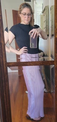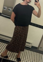 Paired this with the Plan C pleated skirt. The top was so comfortable, but it is more on the cropped side. Still long enough to tuck in the front. Would rent again!