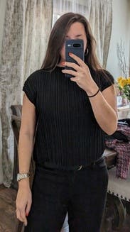 This top is so cute for work. I love that it drapes down softly, it is not tight but it doesn't make you look big either. It is a high neck which I love. The pleats make the top look expensive as does the cut in general. I loved wearing this to work.