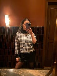 This sweater was v cute, wore to dinner with a skirt and to office christmas party. It was a fun interesting piece, but it is a bit shorter length wise so keep that in mind for styling. It's very thick so it gets toasty v quickly!