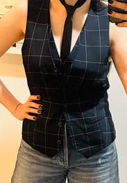 The fit and quality on this vest were outstanding. While wearing it open with the built in crop top just wasn't for me, the built-in layer did add enough support so I didn't need a bra, and created a tailored detail that I liked. I may rent again to try it with the matching pants because it's such a great piece.