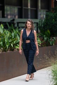 This modern 3.1 Phillip Lim x RTR vest features a windowpane check pattern with a unique cut-out waist, offering a contemporary twist on classic suiting. Pair it with its matching trousers for a coordinated, sophisticated look, and accentuate with minimalist jewelry.