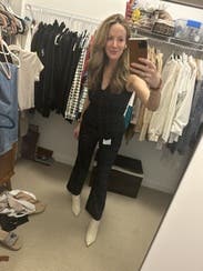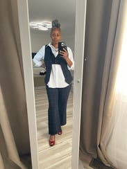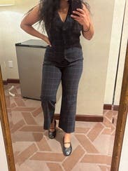 Got this outfit not totally understanding it had a built in crop top. Surprise! Ended up making it work professionally by buttoning up all the way and then took this fun snap afterwards showing off the crop! Pants fit tts. Top was a little big so I wore a bralette underneath to support the girls.