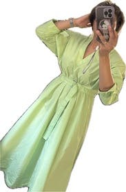 The 3.1 Phillip Lim x RTR Poplin V Neck Midi Dress features feminine sleeve ties, and a blouson top with an adjustable belt, creating a flattering A-line silhouette. Pair it with strappy sandals and minimal jewelry for a polished daytime look