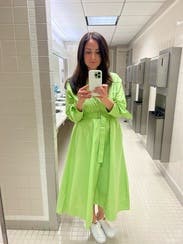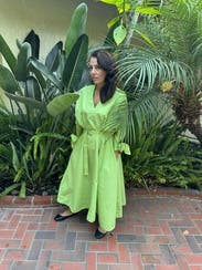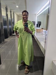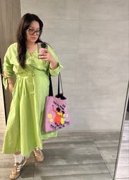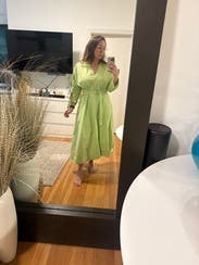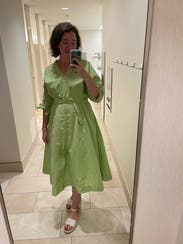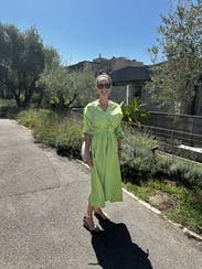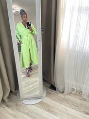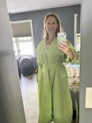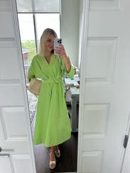 I recently started going to the gym and always hit up the steam room then shower before leaving. It’s been challenging figuring out how to get dressed in a locker room again. Enter this dress!!! She didn’t really wrinkle in my gym bag, was super comfortable and easy to wear WITHOUT A BRA, and I went to meet up with a friend for breakfast. Moments later, I got a text from another friend who was like, “are you wearing a bright green dress?” Lol! It’s cute and funky but also kinda understated and I HIGHLY recommend