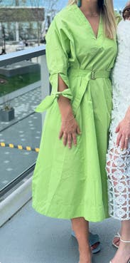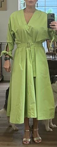Fabulous color and fabric and looks chic. Wore to an art gallery preview event. However- shows ANY stain and does not clean easily. I sweat a tiny amount in this and it visibly showed so quickly. Also- no way to secure the belt once cinched so it hangs down. Runs slightly large.