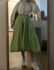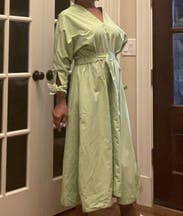 A great green moment and happy with my rental. Came with tags on. Lots of skirt material but it works. Light weight. Will come ironed but wrinkle with slight touches...no big deal but something to be cautious of. Material may show it if the slightest drop of water gets on it.
