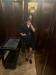 Puffy sleeves, sheer fabric over silky liner, rufflely flair on the bottom, belt… that sounds like a lot, but somehow it works! This has a LOT of personality for a little black dress. I wore it with professional heels for a work presentation and also dressed it up with fun accessories for a party. Lots of compliments at both! Will rent again!