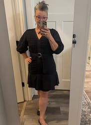 This dress strikes a balance between structure and softness. The textured fabric and belt define the waist and the flounce hem adds just the right amount of movement and fun. It’s comfortable yet chic — perfect for work events, dinners, or a night out. I love how it pairs with flats and heels. Definitely a closet favorite!