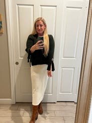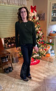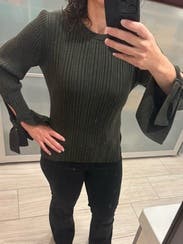 Such a great quality and great fitting sweater. Just long enough to cover the tummy and the sleeves make it extra special.