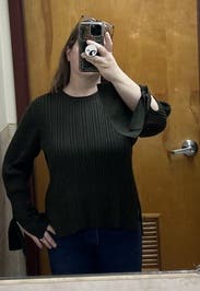 Great fit and flattering. The bell sleeves, cut with a bow are unique and I love this sweater.