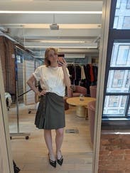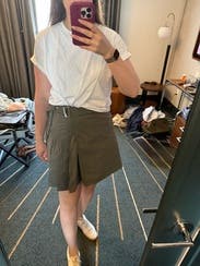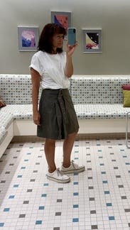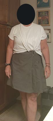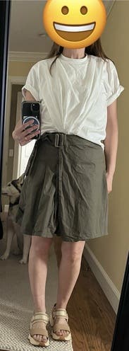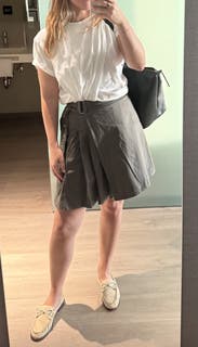 I would buy if it wasn't $$$$. Wore several times for work and errands. The T-shirt part is designed to have the perfect tuck already done PLUS perfect draping from shoulders to tuck. The skirt part is adjustable thanks to the belt. A little long, hit me just above the knee (I have long legs) and was very work appropriate as a result but petite ladies this might be too much fabric on you. Wore with sneakers and dressy flats alike.