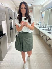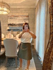 Looks put together but so easy to wear. Skirt is plenty long! Does get wrinkled after wearing for a bit if you care about that kind of thing.