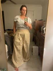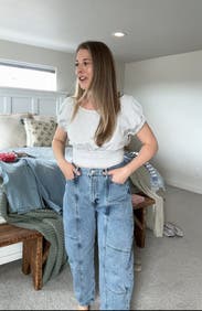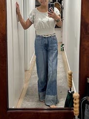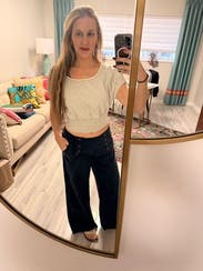 I do think this top is cute! However, when you raise your arms, the shirt rises with you and it’s already cropped. So I had to think about it when I was wearing it more than I liked. Buuut- cute take on a sweater if you want to dress it up a little. Would probably have sized up for a more comfortable fit.