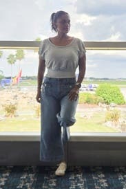 Love the cropped length for petites. Flattering with the wide band at the bottom. Fashionable casual look.