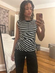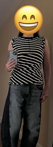 This is a high quality, surprisingly structured sleeveless top (it seems more formal than a tank top, which is how it's labeled) that is nicely forgiving with ruching in the tummy area. It's longer, almost tunic length, even on a long torso 5'9" person like me. I enjoyed wearing it out to brunch and would rent again.