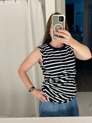 I wanted to love this -- it has ALL the ingredients... b&w, stripes, ruching... but it made me feel frumpy.