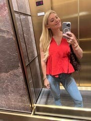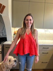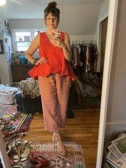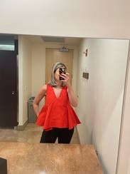 This is a universally flattering top, with the V neck and the trapeze hemline. This is a must rent - tons of compliments and eye catching tomato red color!
