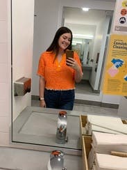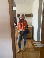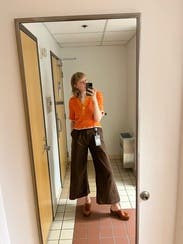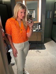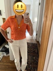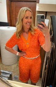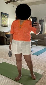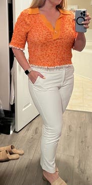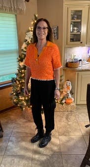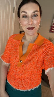 Wow that is orange! No one will miss you! Are you rooting for the FL Gators today? Hard to match in work appropriate since the shirt is short, hit at your true waist. I wore with high waisted navy skirt. Looked great on zoom meeting! Loved the color, texture, orange and white thread neckline, for me, more versatile if it was just a smidge longer. Very cute bright