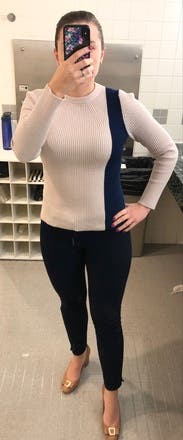 I loved this sweater, it was simple but fit so well, felt chic and flattering. My husband joked that it looked like I had my purse on with the stripe but I liked the pop of color.