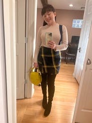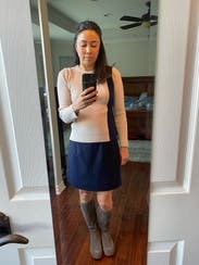 This sweater is warm and made with nice thick material. It looked so-so with dark blue jeans but much better with a navy skirt, which gave the outfit a color-block feel.
