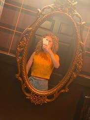 very cute top! Paired great with jeans. Fitted but not snug. Loved the bright gold color.