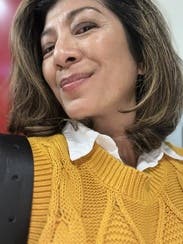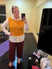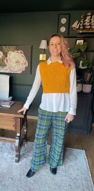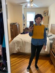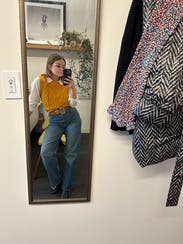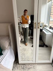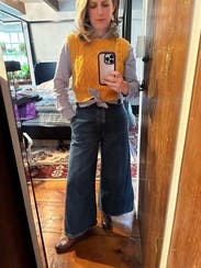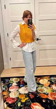 Paired with Khaite Darcy and a JCrew button down with sequin detailing at the sides since the arm holes are wide. Cropped length is great for petites to pair with a super high waist. Color is mustard-- pairs beautifully with bronze, blue, chestnut, mahogany.