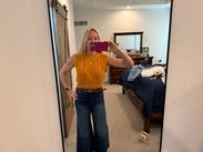 I wore this with a puff sleeve button up for a casual day in the office! Love the crop as it fit perfectly for high waisted pants. Fun color!