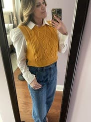 I was excited to try the sweater vest trend. Wore this sweater with a button down and wide leg jeans. Looked classic & chic.