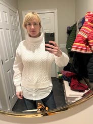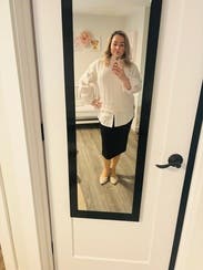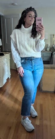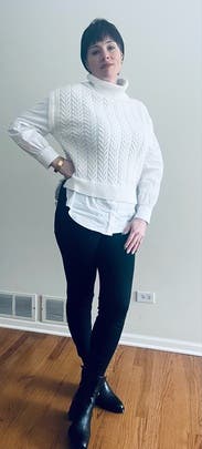 I rented this for a work trip but wasn't able to wear it because the temperatures were higher than expected and it was too hot with the turtleneck. It was very cute on and I loved the contrast combo of the shirt and sweater.
