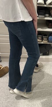 These are a great pair of updated jeans with a side slit and a little stretch.