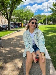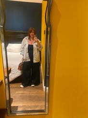 Great layer to wear over a navy patterned sundress to the office. Also a fun layer for a foggy beach morning. Lots of compliments. Oversized look so I rolled the sleeves. Fun rental.