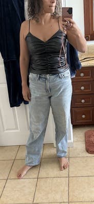 Fun top but a few improvements were needed. With a small chest I wore BOOMBAs to fill out the top. The straps were slightly long for my shoulders which fell down, so I used a broche to bring the straps together in a cross-back and the top fit perfectly after that. I preferred the look of the straps appearing as a halter (for me). The length of the top was a little long where the runched material is bunched up at the belly, and I could not pull it down to stretch it out. I'd rather the top was more cropped but I'm short.