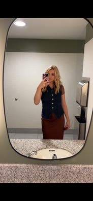Super cute jean vest, I wore to work and HH, it was a little tight at first but then throughout the day it felt just perfect. i would size up for anyone with larger brests