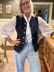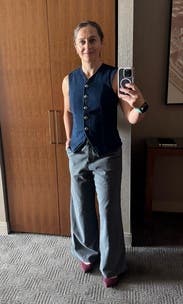 This dark wash denim vest is very flattering. The denim is stiff with no stretch, so it feels a little tight, but it has a great waist-cinching effect. If you have a larger bust, you might want to size up because it’s not very forgiving. The buttons are a little difficult to maneuver, but they’re very sturdy and stay closed without gaping.