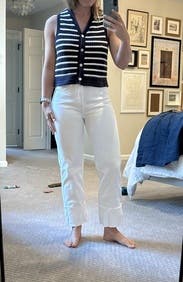 I went up a size in these per the reviews (and usually a good rule for white pants). The waist was still VERY tight. I wore them and love the fit otherwise, but the waist got uncomfortable by the end of the day.