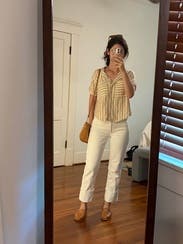 These are fun jeans and the cuff at the bottom is different. I found them easy to style with a looser casual button down. They run very small. I would size up 2.